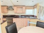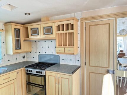 CUISINE avec disposition fonctionnelle, entièrement équipée de grands placards et un plan de travail. Il est équipé d’une plaque à gaz à quatre brûleurs, d’un four intégré avec grill, d’une hotte extractrice, d’un réfrigérateur avec congélateur intégré et d’un évier d’angle près des fenêtres.